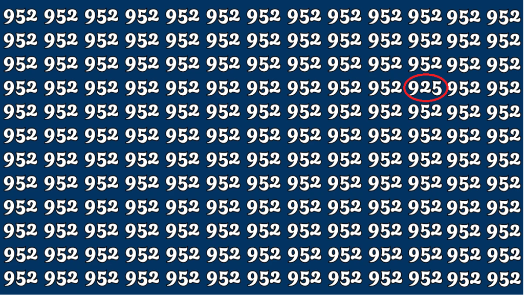Are you prepared to put your visual perception to the test? This optical illusion challenge will test your observation abilities to their limit! The work is easy but tough. You only have 9 seconds to find the number 925 concealed among a sea of 952.