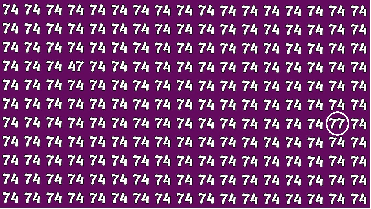 Optical illusion challenges are a fun way to see how sharp your vision really is. At first glance, every piece of this puzzle appears to be identical. The grid is filled with the number 74 repeated multiple times. However, two sneaky numbers, 77 and 47, are hidden somewhere inside. Your task is straightforward but tricky. Can you find both of them before time runs out?